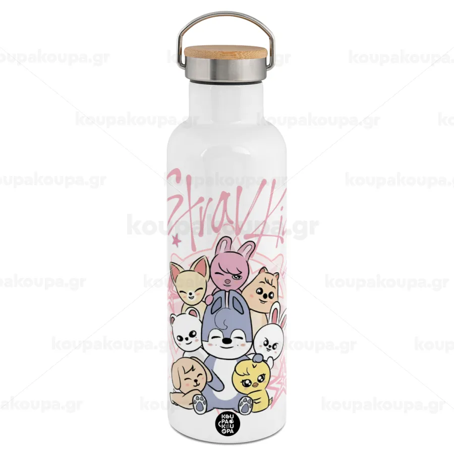 Stray Kids Pink, Stainless steel White with wooden lid (bamboo), double wall, 750ml