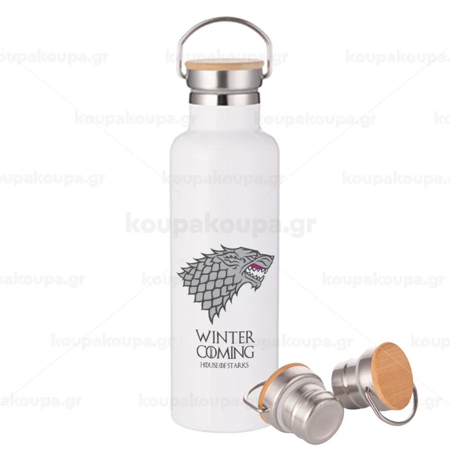 GOT House of Starks, winter coming, Stainless steel White with wooden lid (bamboo), double wall, 750ml