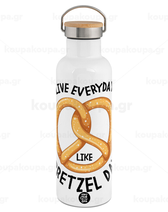 The office, Live every day like pretzel day, Stainless steel White with wooden lid (bamboo), double wall, 750ml