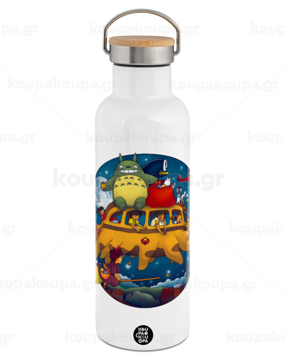 Totoro Catbus, Stainless steel White with wooden lid (bamboo), double wall, 750ml