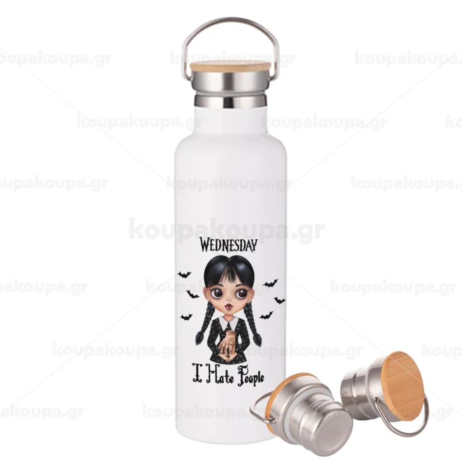 Wednesday Adams, i hate people, Stainless steel White with wooden lid (bamboo), double wall, 750ml
