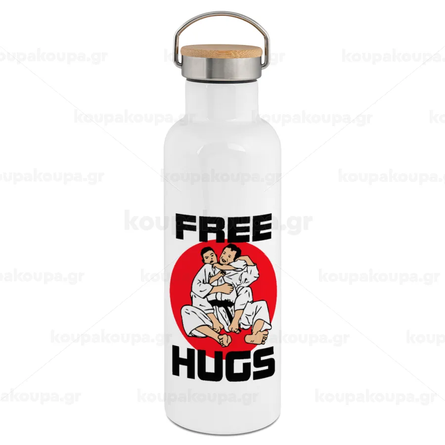 JUDO free hugs, Stainless steel White with wooden lid (bamboo), double wall, 750ml