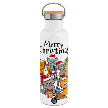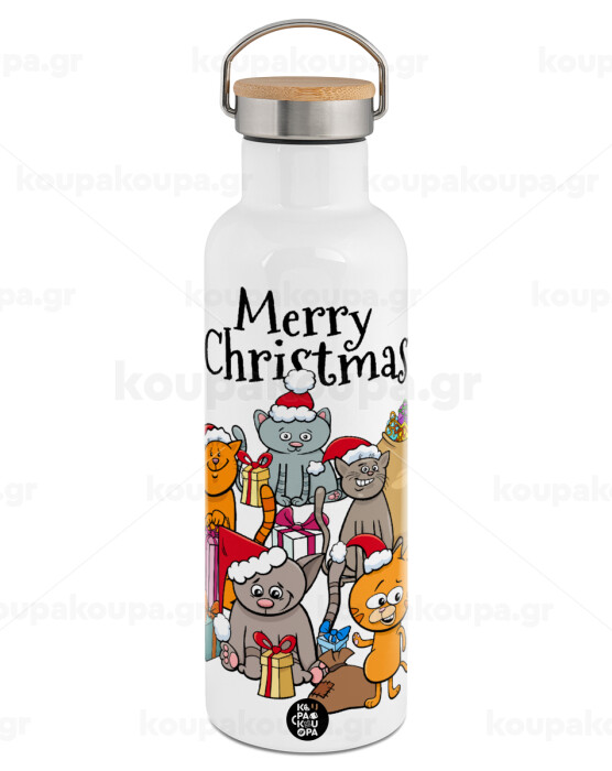 Merry Christmas Cats, Stainless steel White with wooden lid (bamboo), double wall, 750ml
