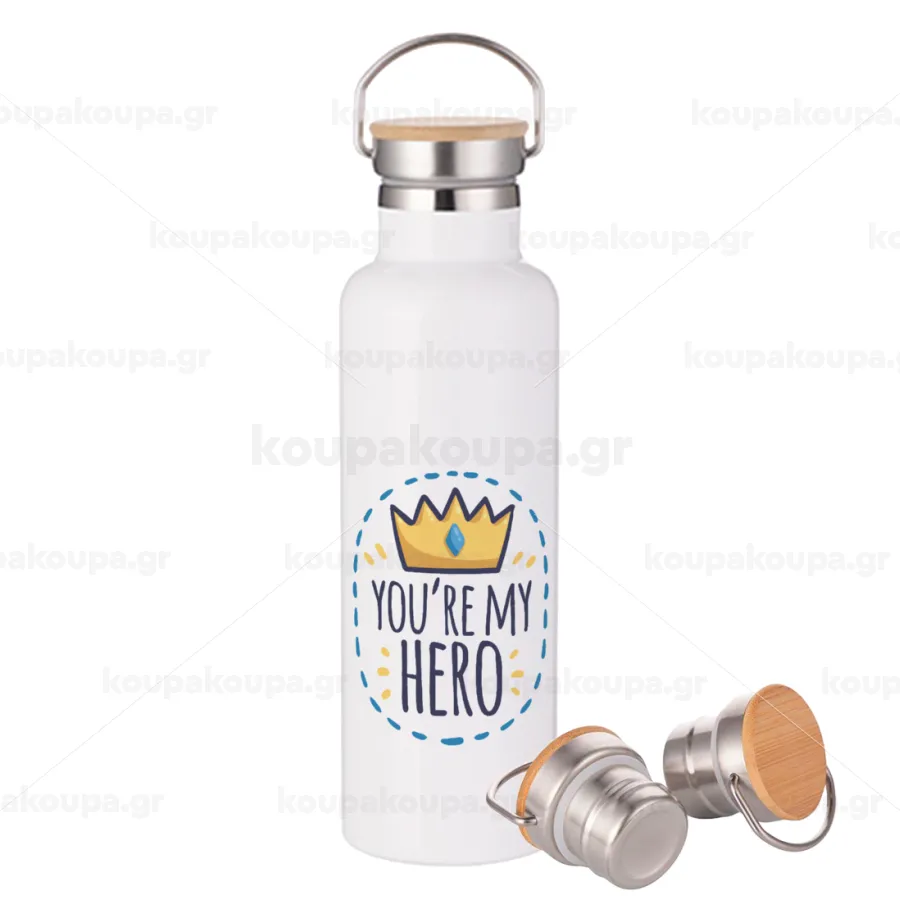 Dad, you are my hero!, Stainless steel White with wooden lid (bamboo), double wall, 750ml