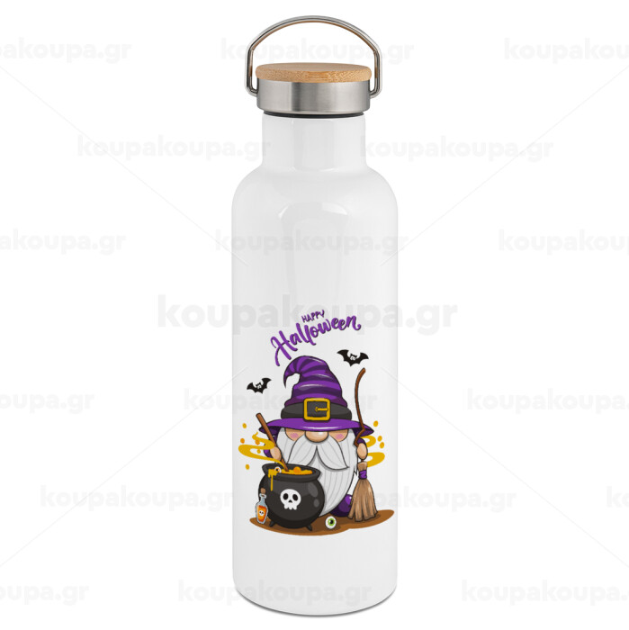 Happy Halloween (Χαλοουίν), Stainless steel White with wooden lid (bamboo), double wall, 750ml