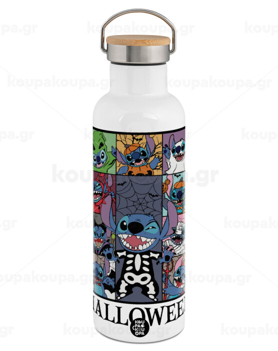Stitch Halloween, Stainless steel White with wooden lid (bamboo), double wall, 750ml