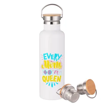 Every mom is a Queen, Stainless steel White with wooden lid (bamboo), double wall, 750ml