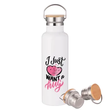I Just want a hug!, Stainless steel White with wooden lid (bamboo), double wall, 750ml