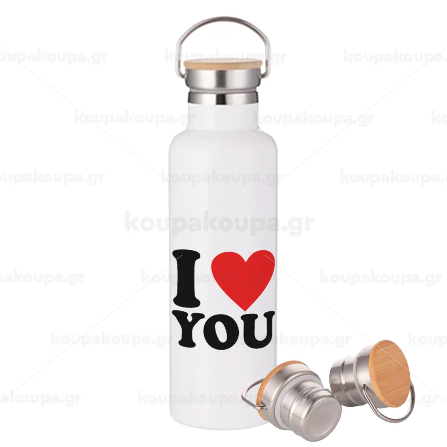 I LOVE YOU, Stainless steel White with wooden lid (bamboo), double wall, 750ml