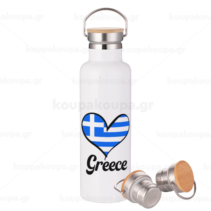 Greece flag, Stainless steel White with wooden lid (bamboo), double wall, 750ml
