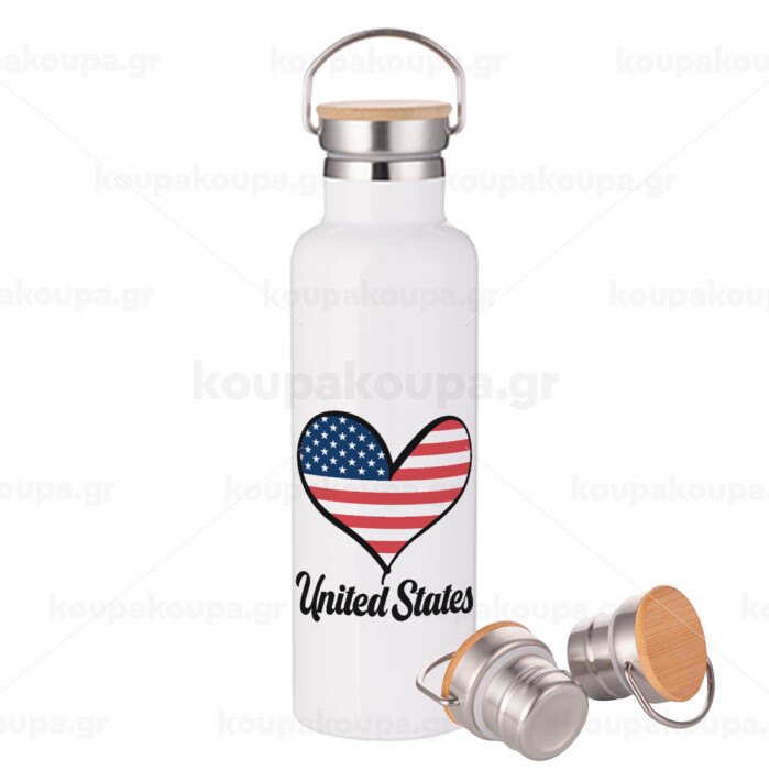 USA flag, Stainless steel White with wooden lid (bamboo), double wall, 750ml
