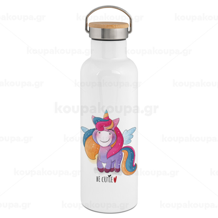 Pink unicorn, Stainless steel White with wooden lid (bamboo), double wall, 750ml