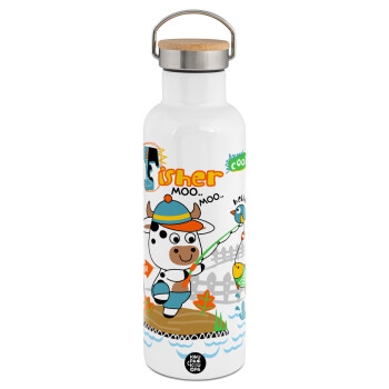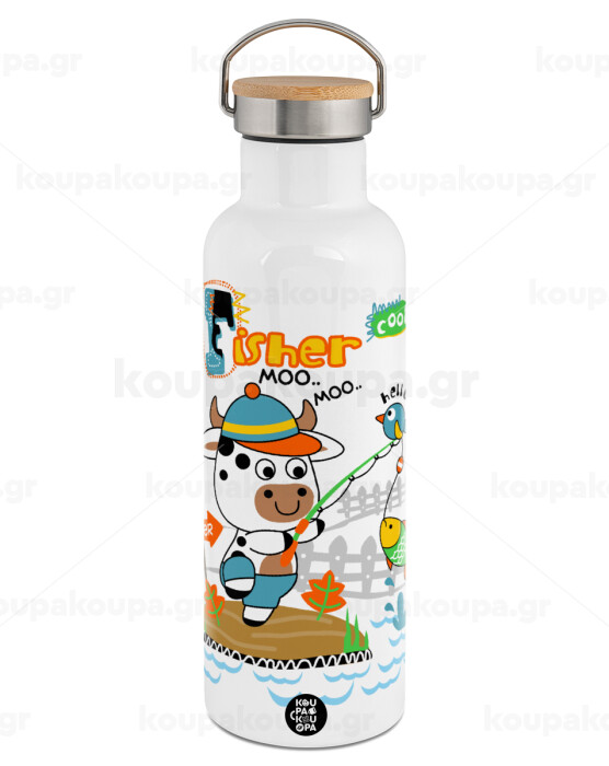Kids Fisherman, Stainless steel White with wooden lid (bamboo), double wall, 750ml