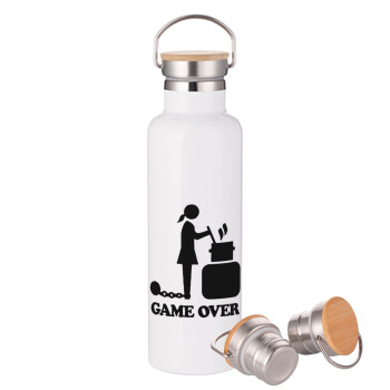 Woman Game Over, Stainless steel White with wooden lid (bamboo), double wall, 750ml