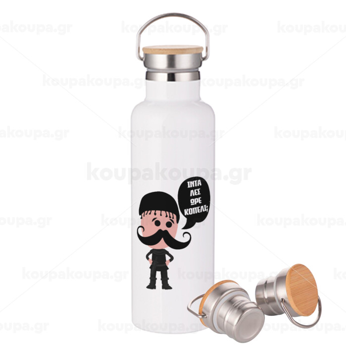 Κρητικός "Ίντα λες ωρέ κοπέλι", Stainless steel White with wooden lid (bamboo), double wall, 750ml