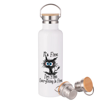 Cat, It's Fine I'm Fine Everything Is Fine, Stainless steel White with wooden lid (bamboo), double wall, 750ml