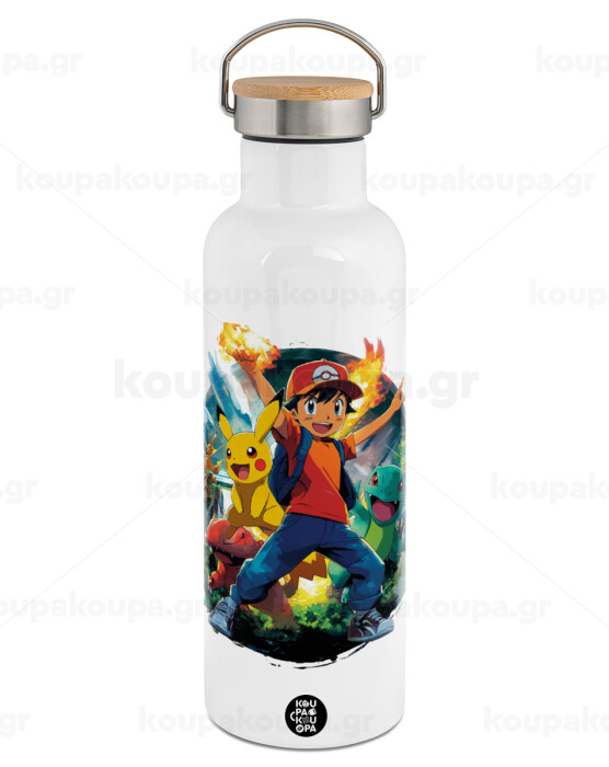 Ash Ketchum & Pikachu, Stainless steel White with wooden lid (bamboo), double wall, 750ml