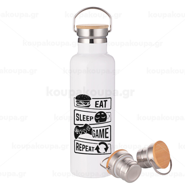 Eat Sleep Game Repeat, Stainless steel White with wooden lid (bamboo), double wall, 750ml