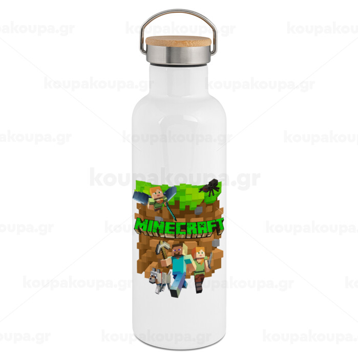 Minecraft characters, Stainless steel White with wooden lid (bamboo), double wall, 750ml