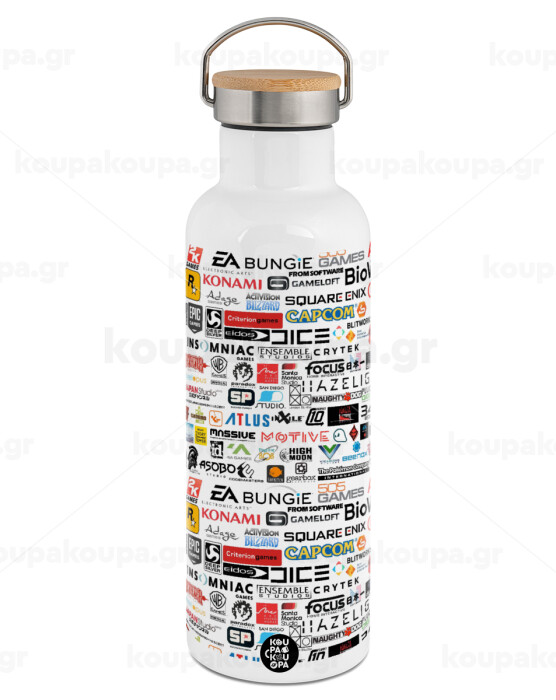 Video Game Studio Logos, Stainless steel White with wooden lid (bamboo), double wall, 750ml