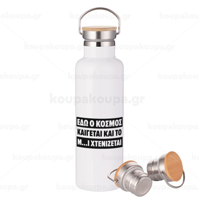 Εδώ ο κόσμος καίγεται και το Μ....Ι χτενίζεται, Stainless steel White with wooden lid (bamboo), double wall, 750ml