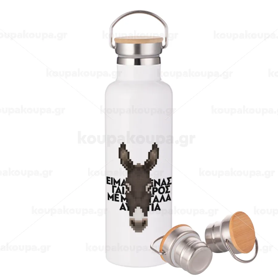 Είμαι ένας γάιδαρος με μεγάλα αυτιά., Stainless steel White with wooden lid (bamboo), double wall, 750ml