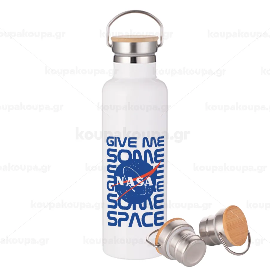 NASA give me some space, Stainless steel White with wooden lid (bamboo), double wall, 750ml