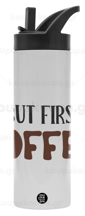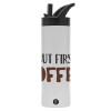 But first Coffee, Metallic thermos bottle with straw & handle, stainless steel (Stainless steel 304), double-walled, 600ml.