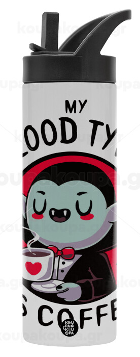 My blood type is coffee, Metallic thermos bottle with straw & handle, stainless steel (Stainless steel 304), double-walled, 600ml.