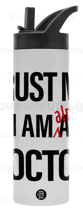 Trust me, i am (almost) Doctor, Metallic thermos bottle with straw & handle, stainless steel (Stainless steel 304), double-walled, 600ml.