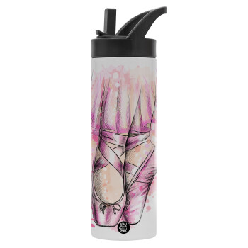 Ballerina shoes, Metallic thermos bottle with straw & handle, stainless steel (Stainless steel 304), double-walled, 600ml.