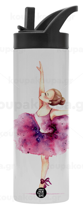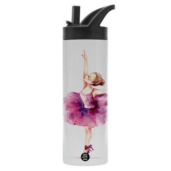 Ballerina watercolor, Metallic thermos bottle with straw & handle, stainless steel (Stainless steel 304), double-walled, 600ml.