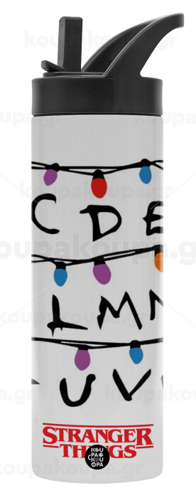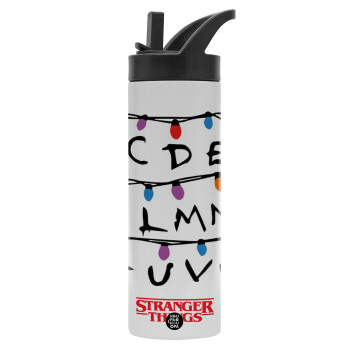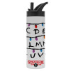 Stranger Things ABC, Metallic thermos bottle with straw & handle, stainless steel (Stainless steel 304), double-walled, 600ml.
