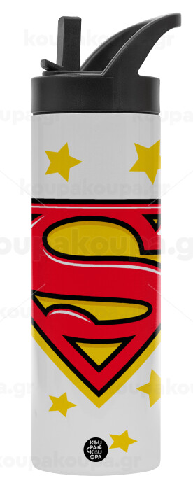 Superman Blue, Metallic thermos bottle with straw & handle, stainless steel (Stainless steel 304), double-walled, 600ml.