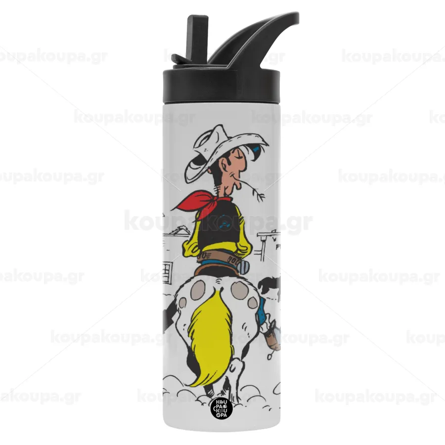 Lucky Luke comic, Metallic thermos bottle with straw & handle, stainless steel (Stainless steel 304), double-walled, 600ml.