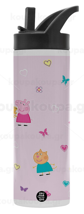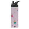 Πέππα το γουρουνάκι και οι φίλοι της, Metallic thermos bottle with straw & handle, stainless steel (Stainless steel 304), double-walled, 600ml.