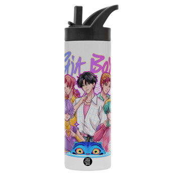 Huntrix Saja Boys, Metallic thermos bottle with straw & handle, stainless steel (Stainless steel 304), double-walled, 600ml.