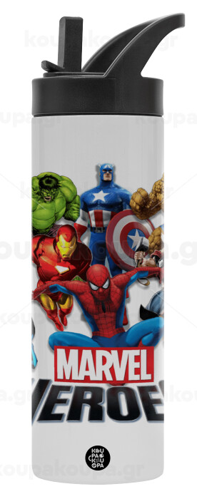 MARVEL heroes, Metallic thermos bottle with straw & handle, stainless steel (Stainless steel 304), double-walled, 600ml.