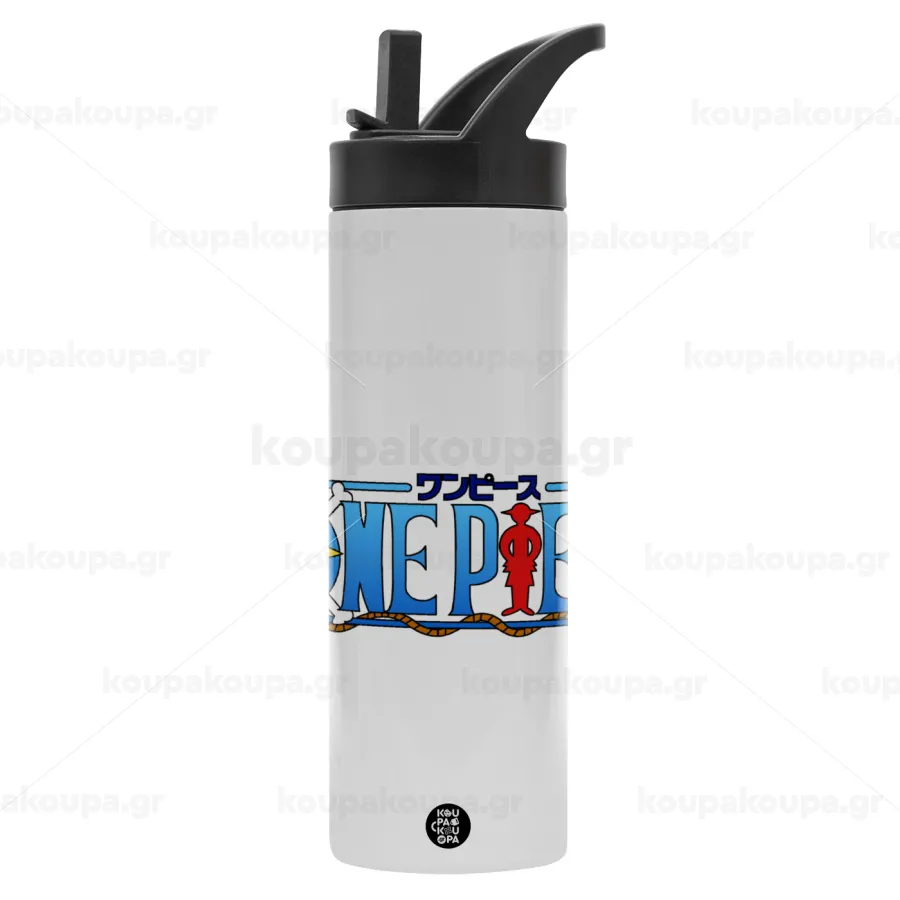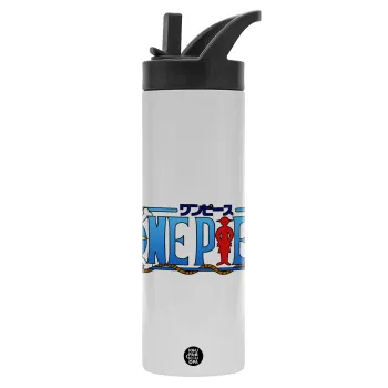 Onepiece logo, Metallic thermos bottle with straw & handle, stainless steel (Stainless steel 304), double-walled, 600ml.