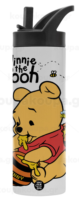 Winnie the Pooh, Metallic thermos bottle with straw & handle, stainless steel (Stainless steel 304), double-walled, 600ml.