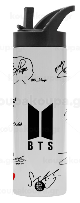 BTS signatures, Metallic thermos bottle with straw & handle, stainless steel (Stainless steel 304), double-walled, 600ml.