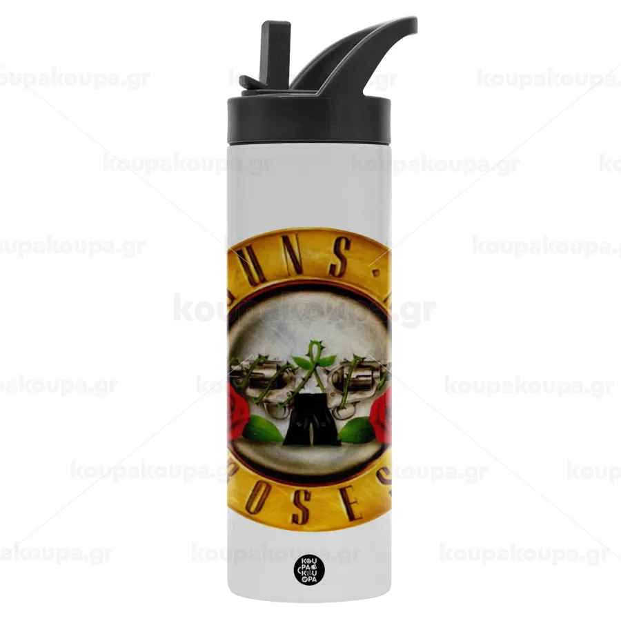 Guns N' Roses, Metallic thermos bottle with straw & handle, stainless steel (Stainless steel 304), double-walled, 600ml.