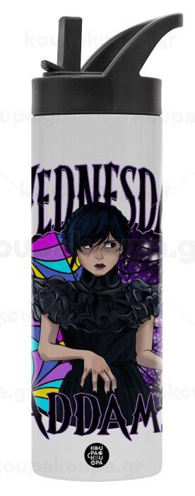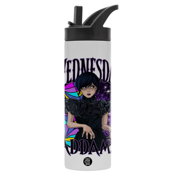 Wednesday Jenna Ortega, Metallic thermos bottle with straw & handle, stainless steel (Stainless steel 304), double-walled, 600ml.