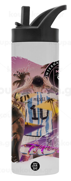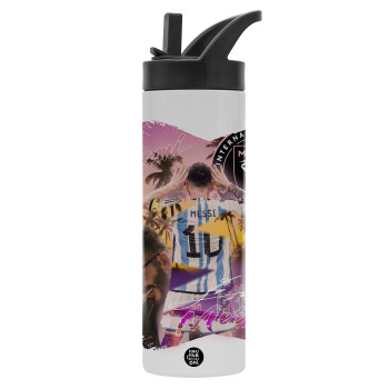Lionel Messi Miami, Metallic thermos bottle with straw & handle, stainless steel (Stainless steel 304), double-walled, 600ml.