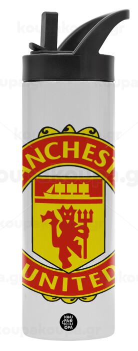 Manchester United F.C., Metallic thermos bottle with straw & handle, stainless steel (Stainless steel 304), double-walled, 600ml.