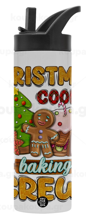 Christmas Cookie Baking Crew, Metallic thermos bottle with straw & handle, stainless steel (Stainless steel 304), double-walled, 600ml.