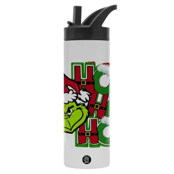 Grinch ho ho ho, Metallic thermos bottle with straw & handle, stainless steel (Stainless steel 304), double-walled, 600ml.