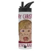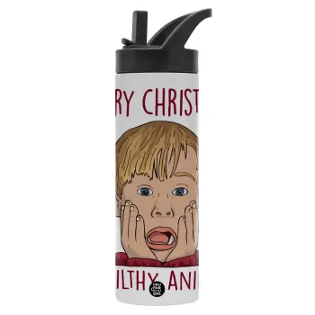 home alone, Merry Christmas ya filthy animal, Metallic thermos bottle with straw & handle, stainless steel (Stainless steel 304), double-walled, 600ml.