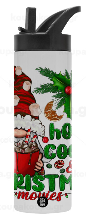 Hot cocoa and Christmas movies, Metallic thermos bottle with straw & handle, stainless steel (Stainless steel 304), double-walled, 600ml.