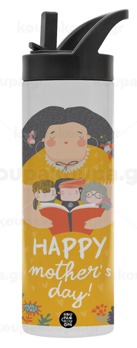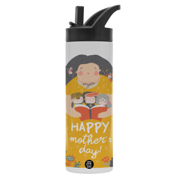 Cute mother reading book, happy mothers day, Metallic thermos bottle with straw & handle, stainless steel (Stainless steel 304), double-walled, 600ml.